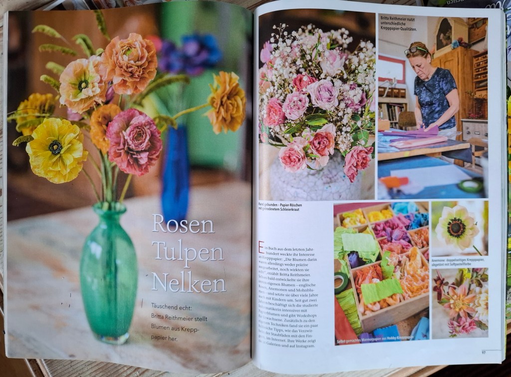 Am Freitag, den 6.2 erscheint in der Ausgabe März/April 26 der Zeitschrift „Mein schönes Land“ ein Artikel über meine Papierblumen mit meinen Bildern. Den Artikel hat die Redakteurin Saskia Brünger nach einem Interview mit mir verfaßt. Die Zusammenarbeit war ausgesprochen effektiv und sehr angenehm. Dies ist nun mein 2. Artikel in einer Zeitschrift. Der Erste erschien in der Landlust Juli/August 2024:
