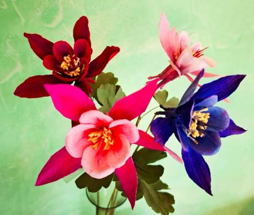 Akeleien aus Krepppapier sehen zu mehreren, mit kleinen Knospen und zarten wellig grünen Blättern täuschend echt aus. Die Farbpalette ist sehr vielfältig. Häufig sind Blau und Lila-Töne, aber auch Gelb, Weiß, Rot oder gar grün. Besonders zart erscheinen sie in Pastelltönen und in tiefdunklen Tönen wirkt sie elegant. Die Blütenmitte weicht farblich oft von den äußeren Blütenblättern ab, ja oft kontrastiert sie diese sogar. Die vielfältigen farblichen Möglichkeiten gepaart mit feinen Farbübergängen bieten einen großen Gestaltungsspielraum.